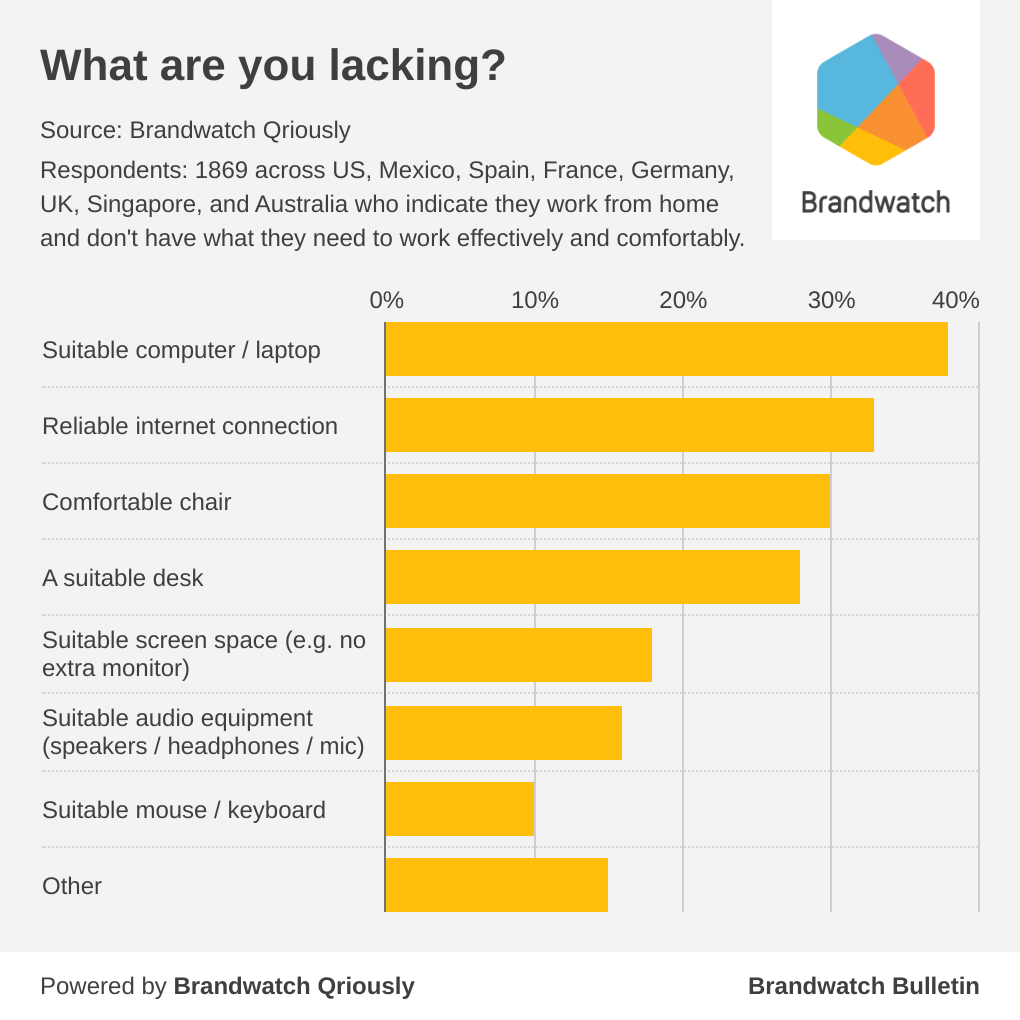 That leaves 54% selecting either ‘Somewhat’ or ‘No’ when asked if they have what they need. That’s a large chunk of the work-from-home workforce ill-equipped to thrive during their working hours.