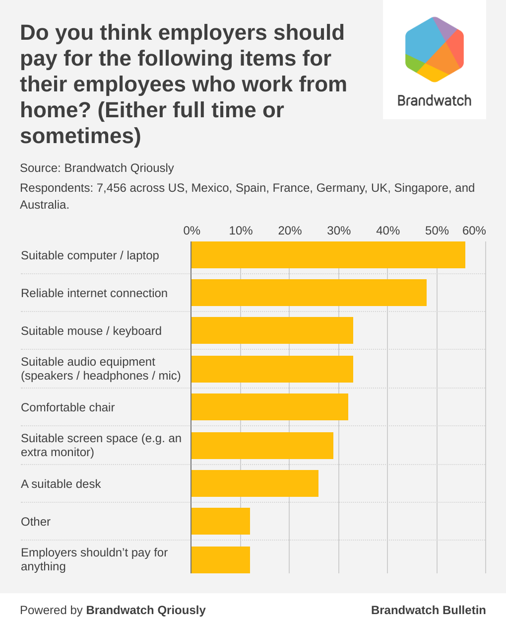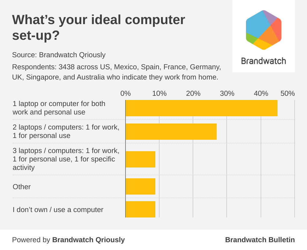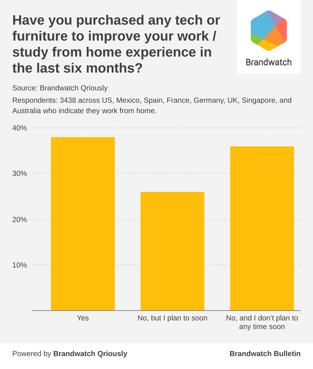 Back in March, a huge portion of the workforce suddenly began working from home. In October, we surveyed 7,478 respondents across the US, Mexico, France, Germany, Spain, the UK, Australia, and Singapore using Brandwatch Qriously. 46% of them reported that they work or study at home all the time or sometimes.