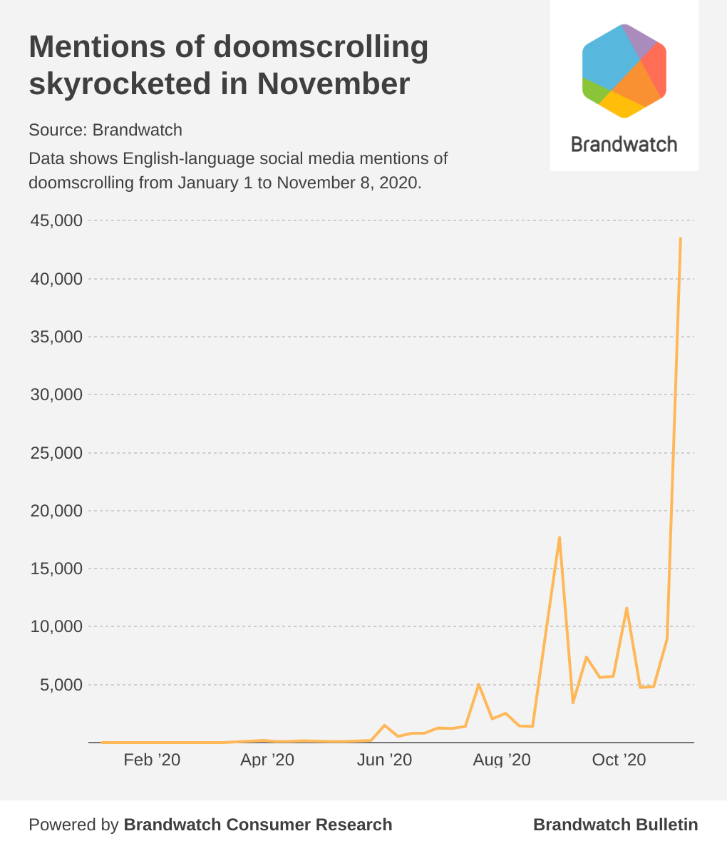 Ultimately, doomscrolling conversation on social media really focuses on the unhealthiness of the habit. Between March 1 and November 8 2020 we found 62k mentions about quitting doomscrolling.