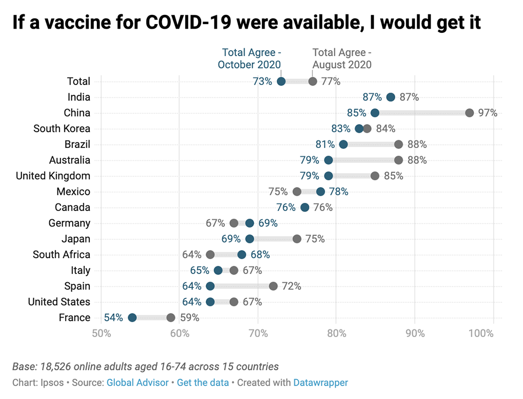 According to Global Advisor, 73% of people would get a Covid-19 vaccine if it became available now, down from 77% in August. This may not seem like a lot, but when vaccine-induced herd immunity relies on a huge section of society being vaccinated, it’s cause for concern. Another cause for concern is just how low the numbers are for countries like France, the US, and Spain.