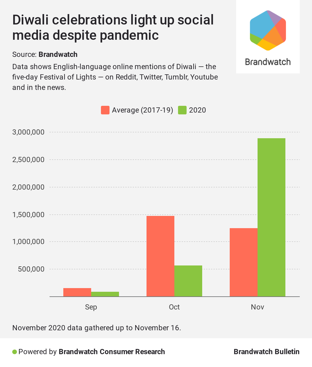 Looking at conversation between November 1 and November 16 2020, we found 3m instances of people wishing others a Happy Diwali on social media. That’s an increase of 6889% compared to the same period in 2019, with many previously in-person greetings going virtual in 2020.