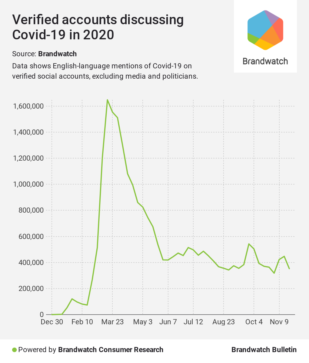 UK celebrities can be dwarfed by stars across the pond, so we have taken a quick look at UK celebrity conversation separately. Springwatch presenter Chris Packham, businesswoman Deborah Meaden, and writer and TV personality Stephen Fry all reached hundreds of thousands of people with their Covid-19-related posts.