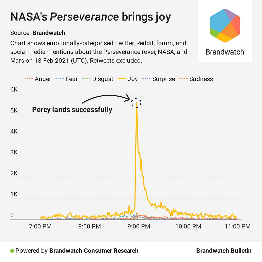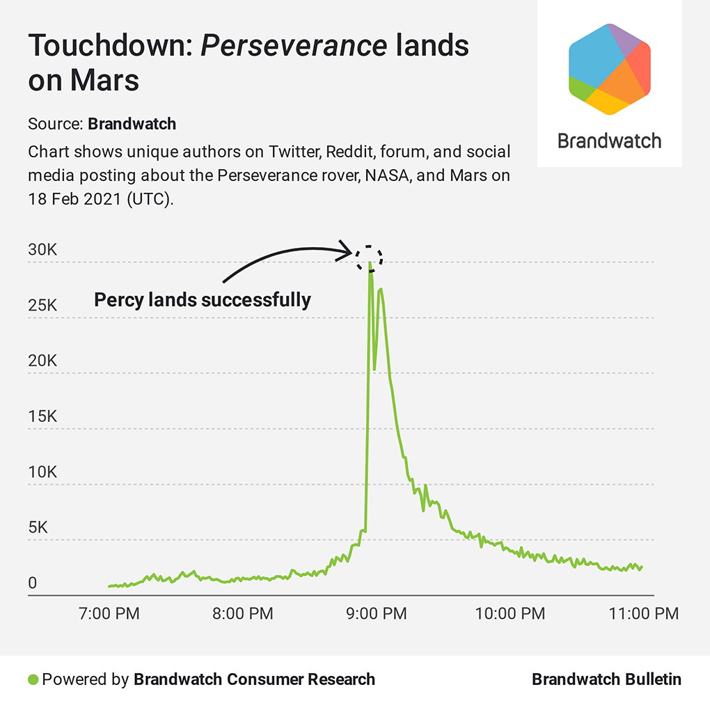 While there was much fanfare at the time, attention waned in the following months as the world’s focus turned from the sky towards more pressing earthly events. From August 2020 through to January 2021, Perseverance (nicknamed Percy), was mentioned just 34k times online.