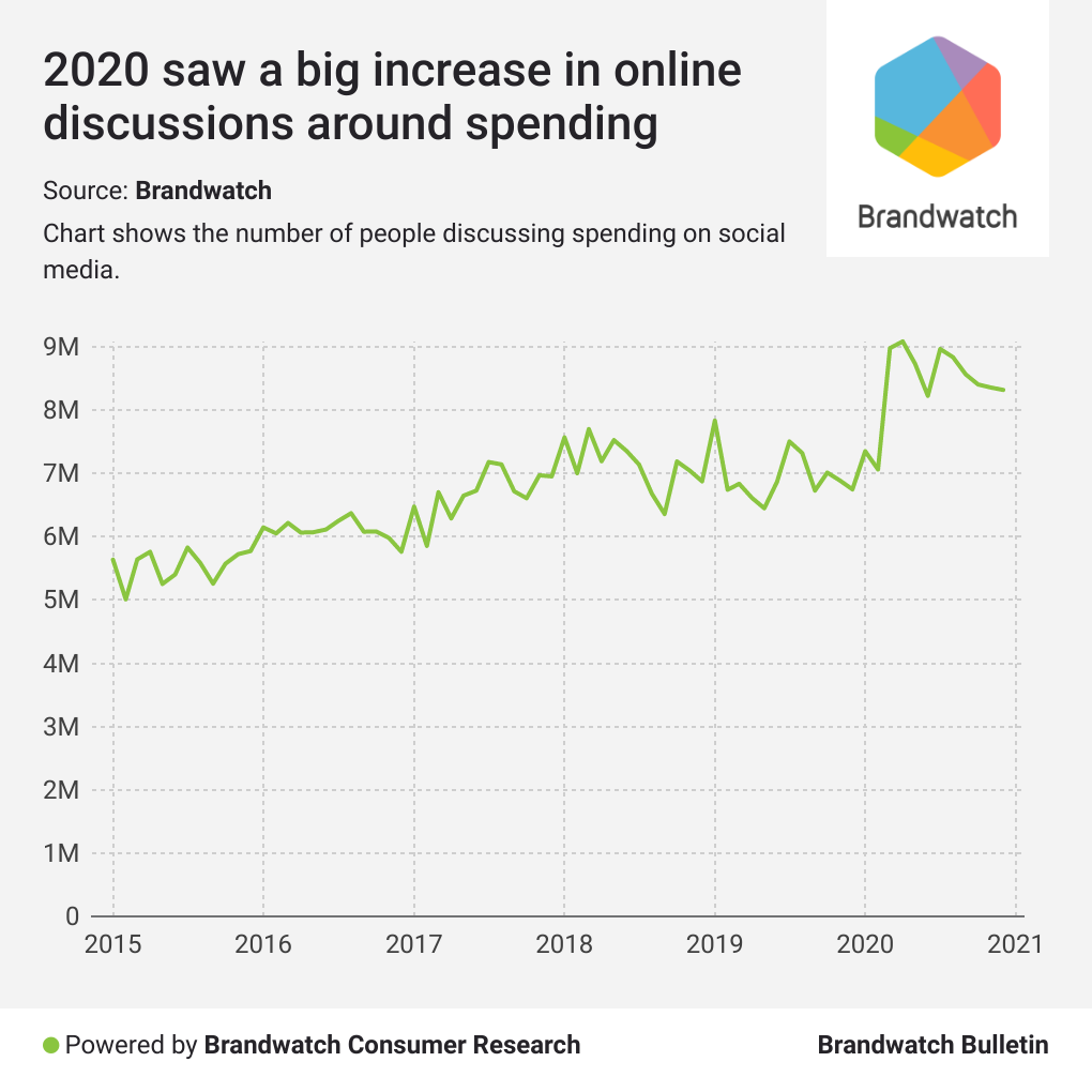 More conversation around spending doesn’t necessarily mean more spending. It simply means that consumers are more compelled to talk about the subject, and therefore there’s more that can be learned from analyzing all the chatter.