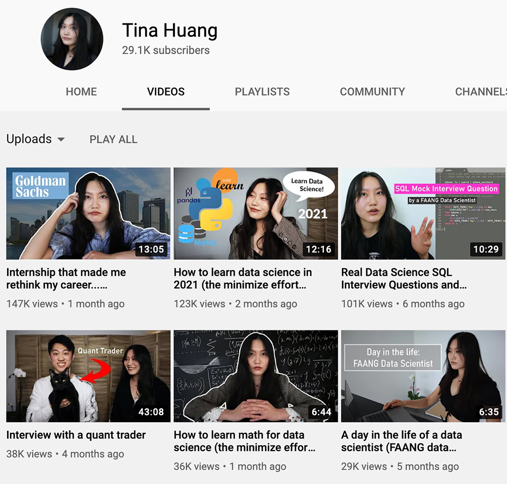 Tina Huang, a data scientist currently working at a FAANG (Facebook, Amazon, Apple, Netflix, and Google Alphabet) company. Her YouTube channel is dedicated to data and computer science, including how to educate yourself in these topics.