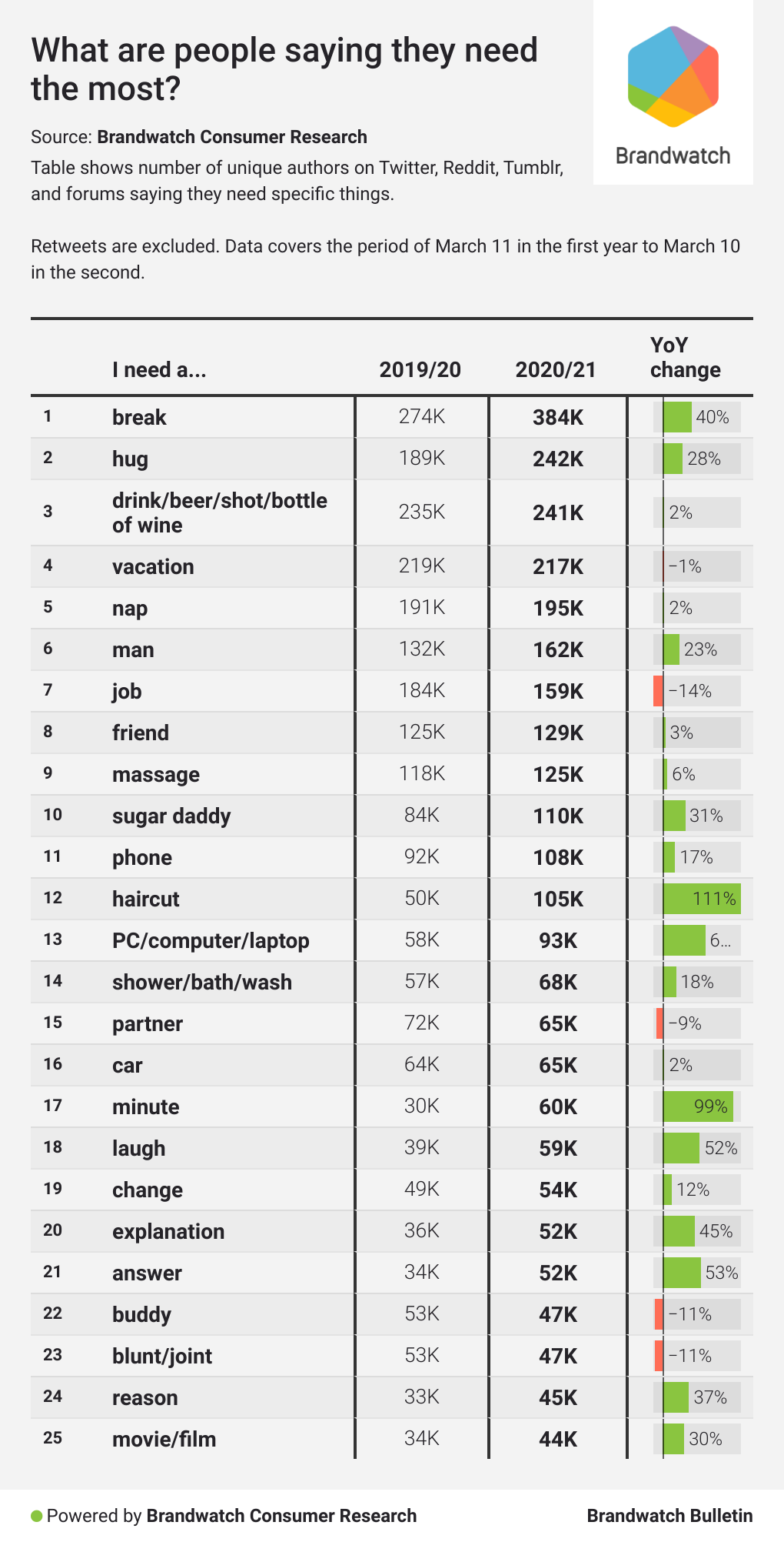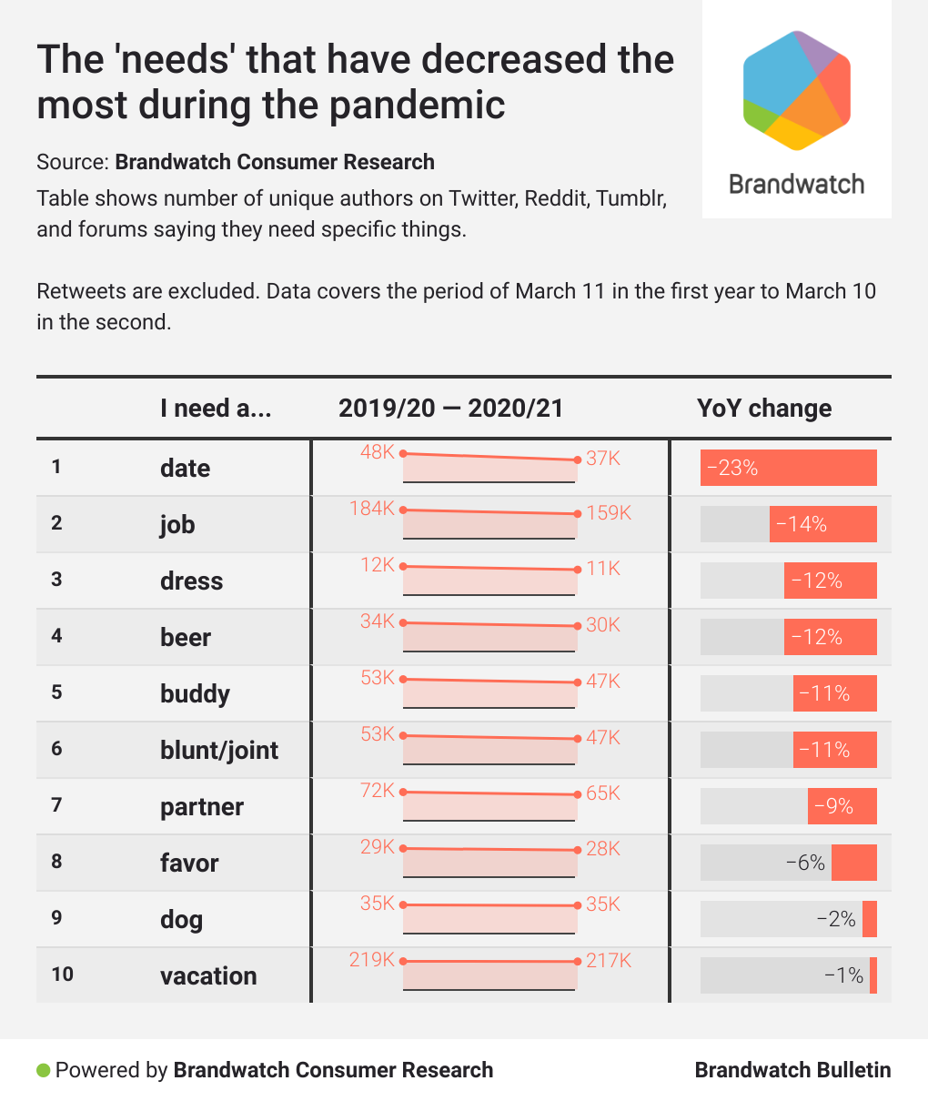 Using Brandwatch Consumer Research, we collected tens of millions of posts containing the phrase “I need a” and then pulled out the items, services, and relationships mentioned most.