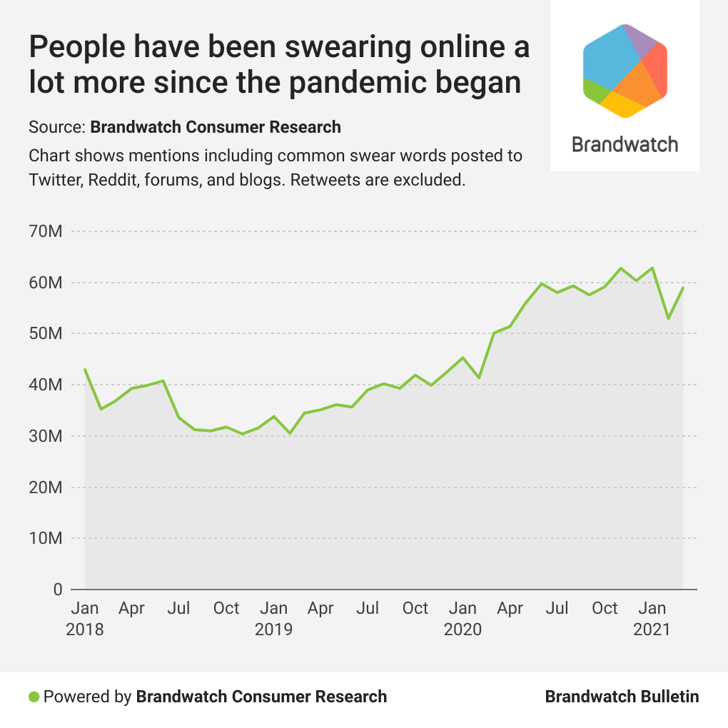 We can end a positive note though. Joyful cursing didn’t make up the biggest piece of the pie, but it wasn’t rare either. People turned the air blue with joy over 64m times since March last year.