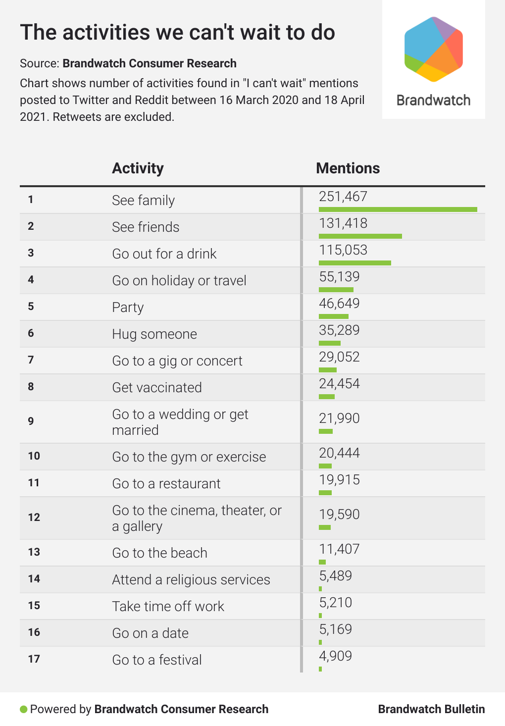 Seeing family is way, way out in front. And with friends coming second, this data tallies with our bulletin on New Year’s resolutions, which showed an increased want to see friends and families.