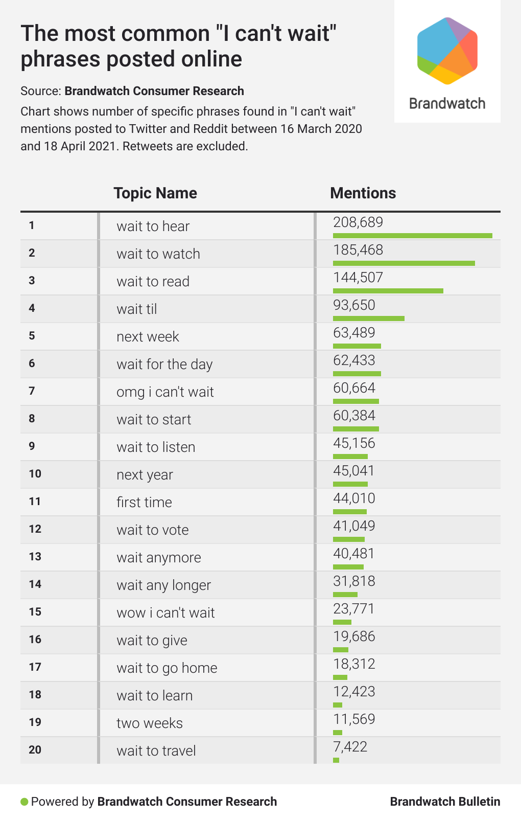 Using Brandwatch Consumer Research, we created a query to collect any posts to Twitter or Reddit containing the phrase (and variations of) “I can’t wait”. Here’s what we found.