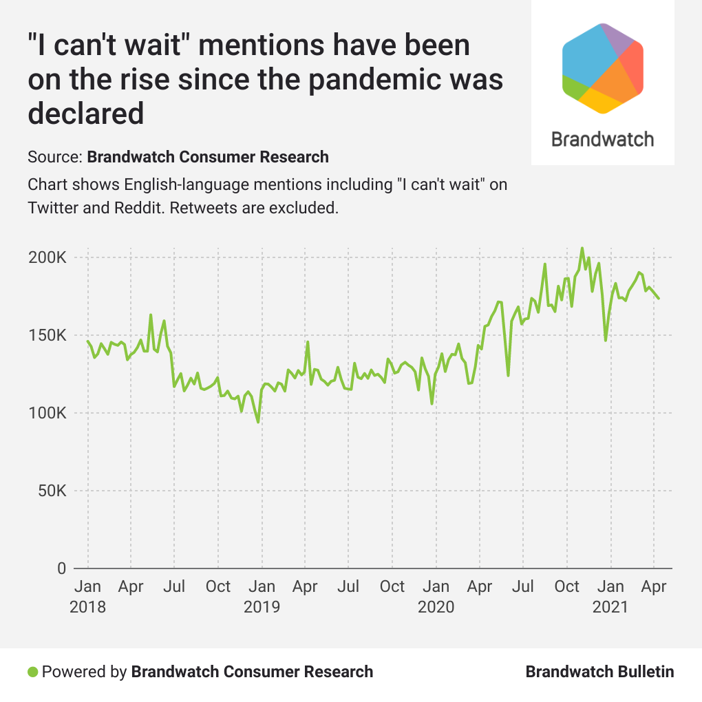 As a starting point, we wanted to see if “I can’t wait” mentions had increased. With normal life heavily curtailed, it makes sense we’d talk more about things we can’t wait to do.