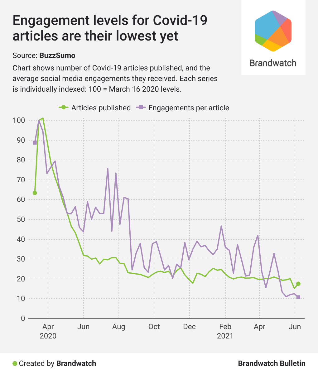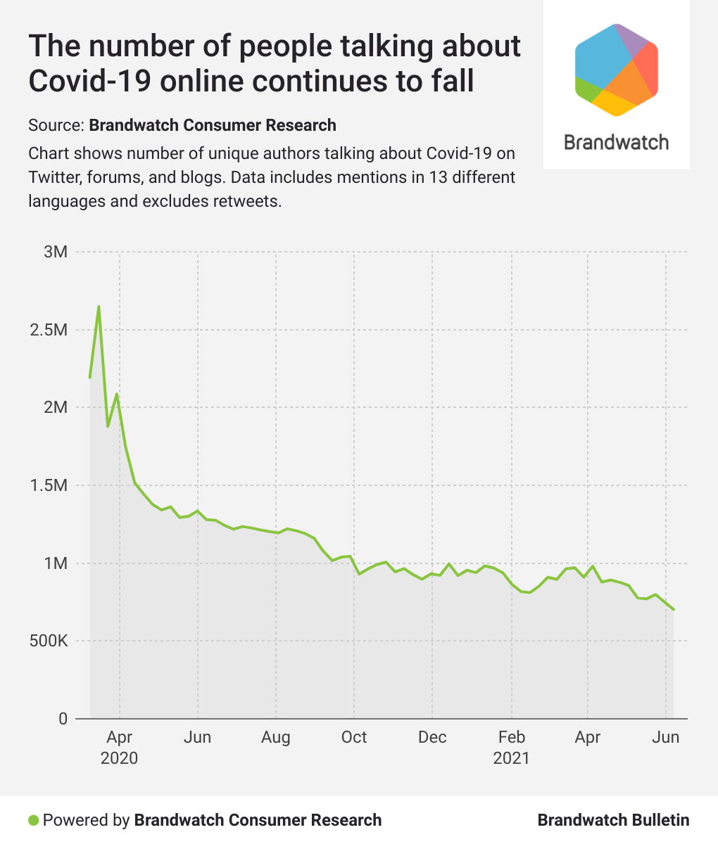 Last year, when this was a bulletin focused specifically on Covid-19, we regularly looked at the size of the online Covid conversation, along with articles covering the virus. It’s been a long time since we last looked, so we decided it was time to revisit. But first, a refresher.