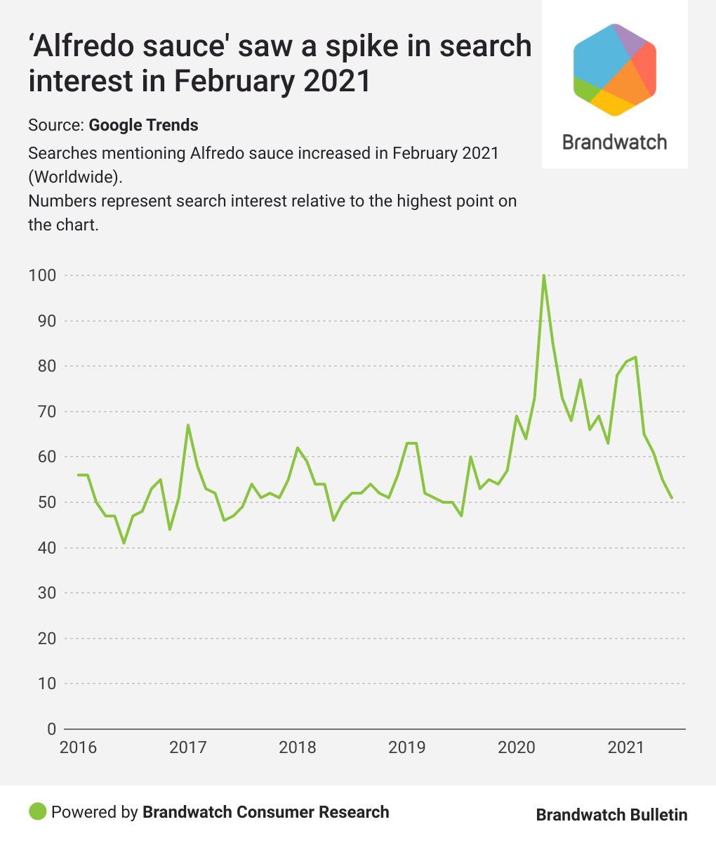A quick glance over the last five years of Google searches related to Alfredo sauce showed that there was also a spike in interest in 2020, but interest around the topic started picking up again in 2021. This time around, it is (hopefully) related to post-pandemic dating rather than stockpiling sauce.