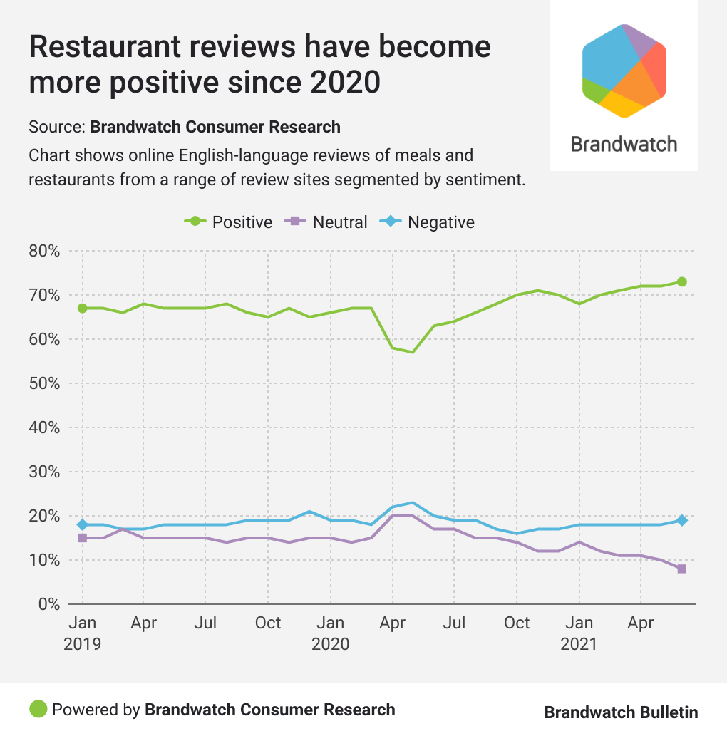 Meanwhile, the proportion of negative reviews has remained incredibly stable in the same time period. When we previously covered this topic, a lot of these issues were to do with apps and delivery drivers. These negative complaints seem to have disappeared now, although a small percentage have been replaced with social distancing complaints.