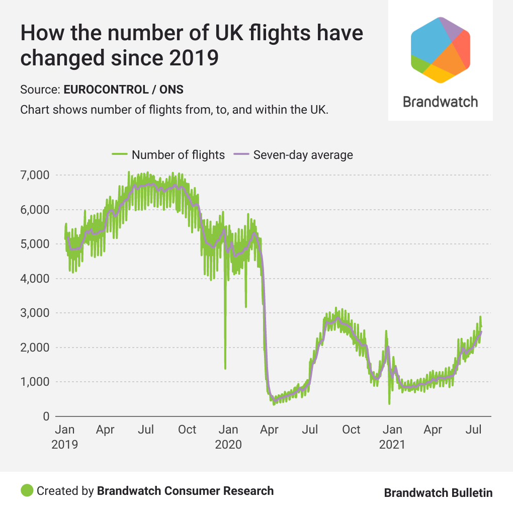 Now as we come to the end of July 2021, flight levels are nowhere near their pre-pandemic numbers, although they are up 40% compared to 2020 for the 1 – 18 July period. Why is the UK airline industry lagging behind?