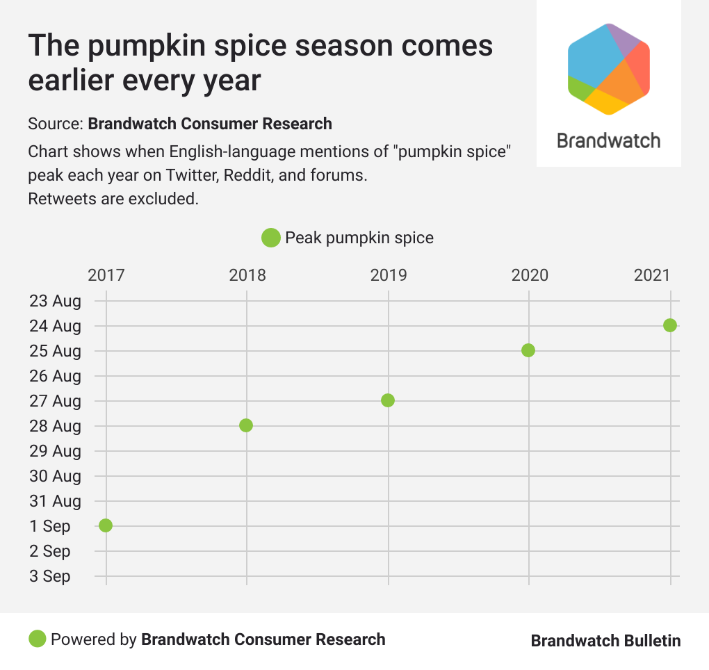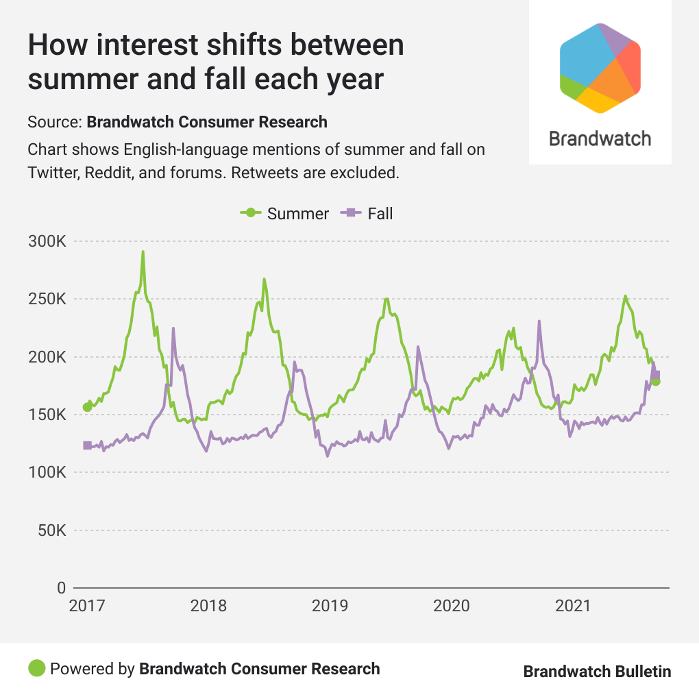 This more negative outlook is borne out in our emotional analysis of fall mentions. In 2019, 42% of them were joyful, while in 2020 and 2021, that number was 38% and 37% respectively.