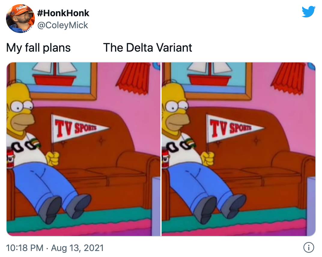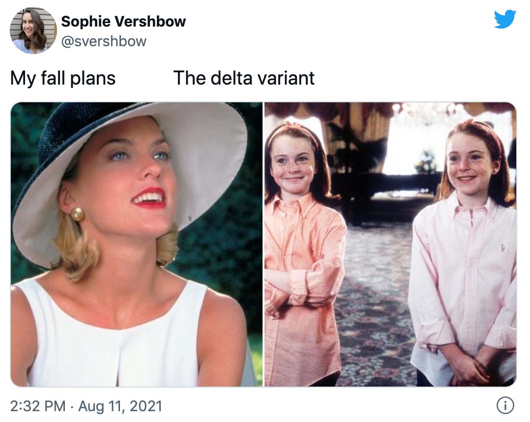 Enter the “my fall plans” meme, which presents a positive image contrasted with a negative one which represents the Delta variant. Here’s one of the most popular examples.