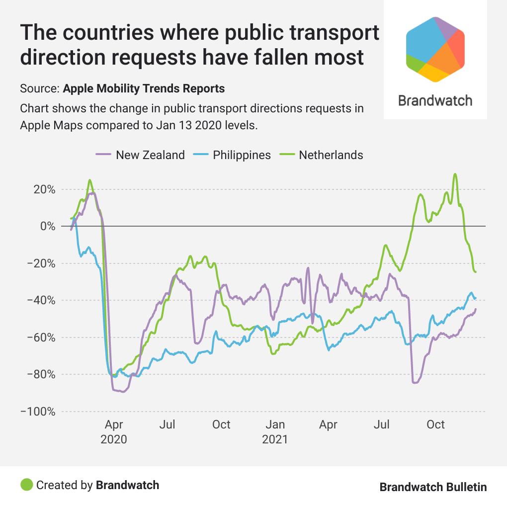 From November public transport direction requests have fallen consistently in all three countries. With the Omicron variant now spreading and case numbers rising in each nation, particularly in Germany, this is no surprise.