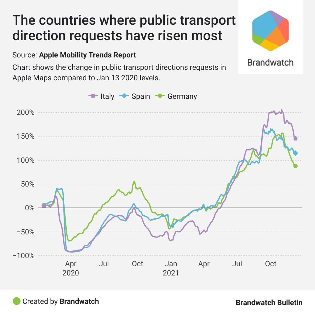 All three countries saw their highest levels of direction requests since the pandemic began in the latter half of 2021. Italy and Spain saw sharp jumps at the end of August which, if we’re right about the influence of tourism, suggests there were some last-minute holidays before the new school terms began.