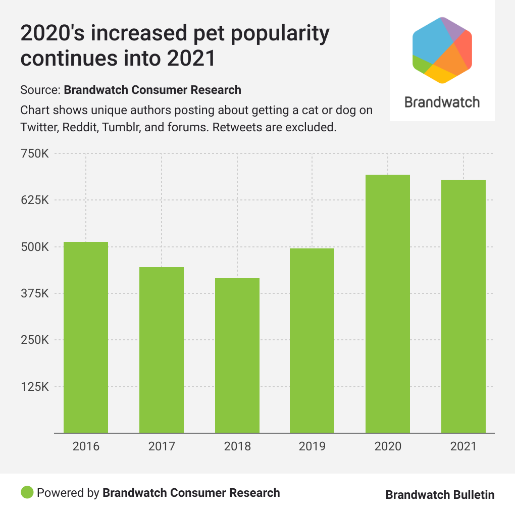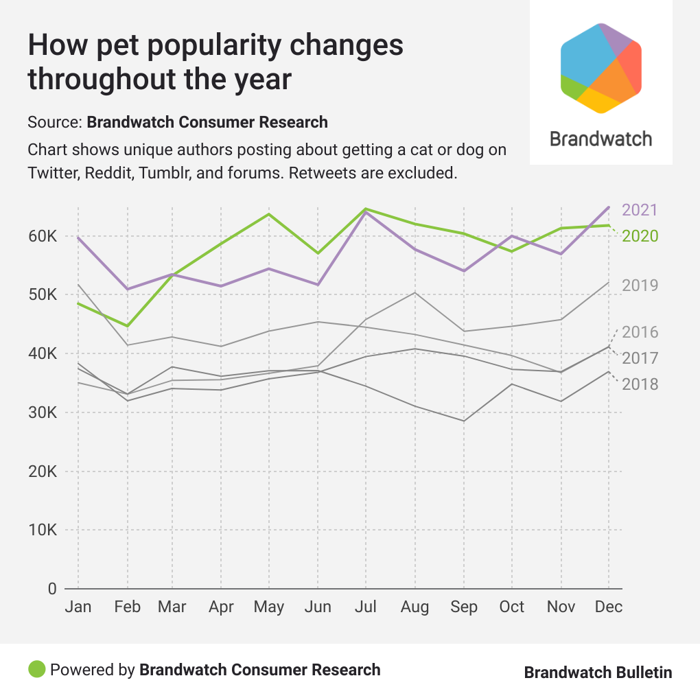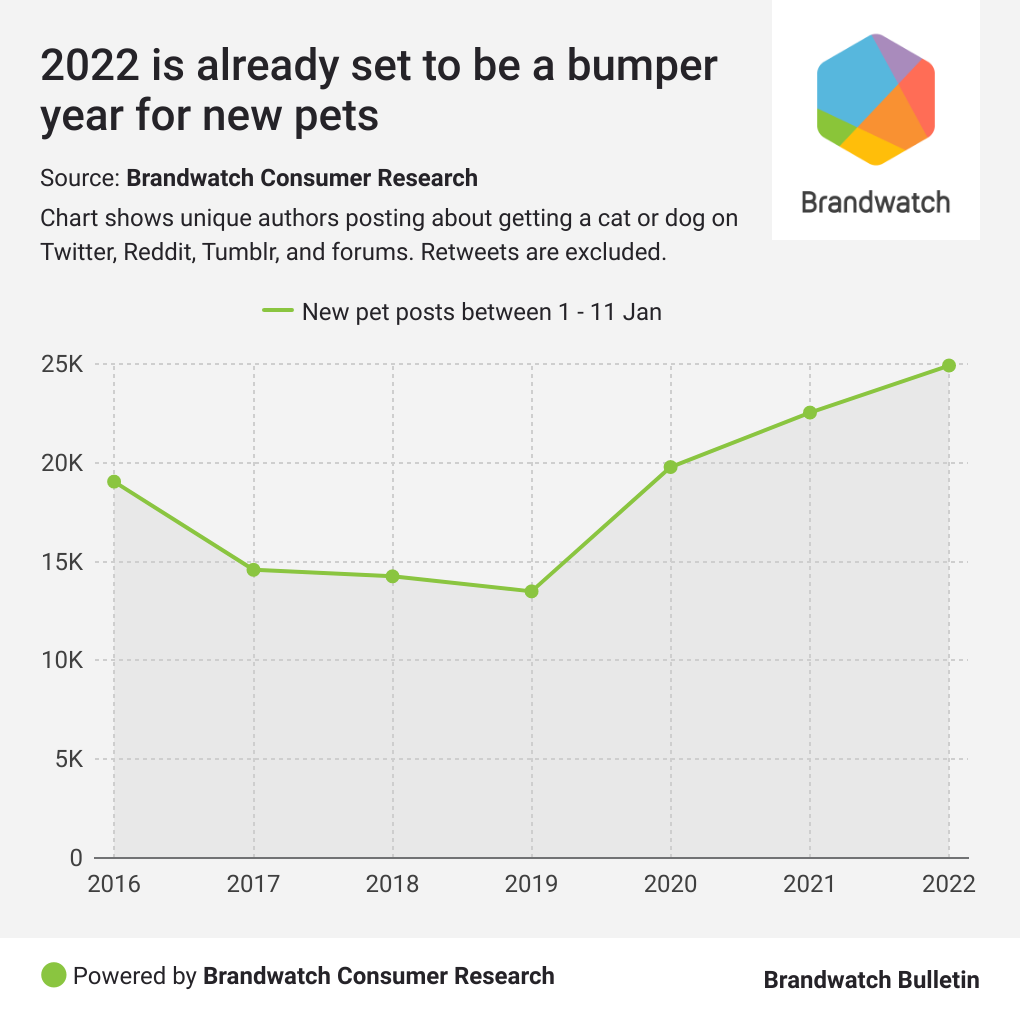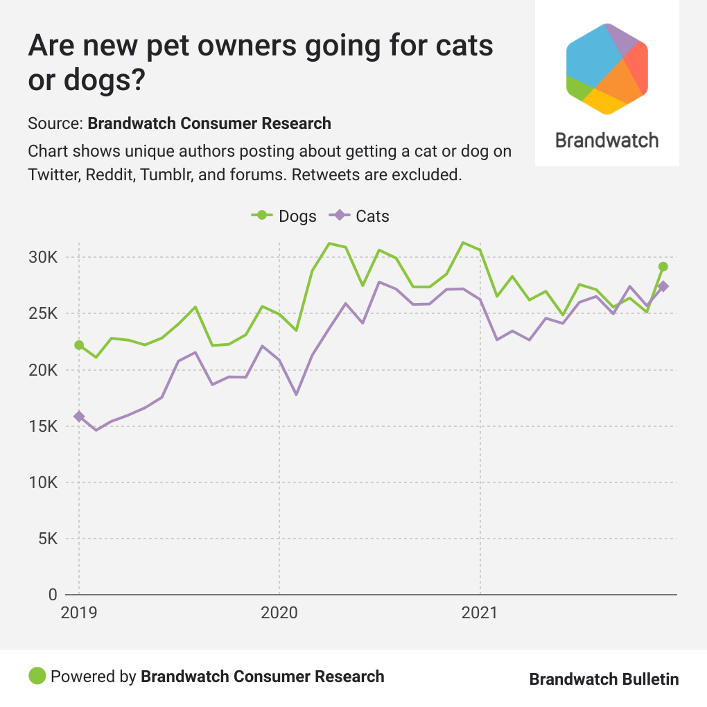 To do so we created a query in Brandwatch Consumer Research to find mentions about getting new pets, specifically cats or dogs (and puppies and kittens too, of course). Looking at Twitter, Reddit, Tumblr, and forums, here’s what we found.