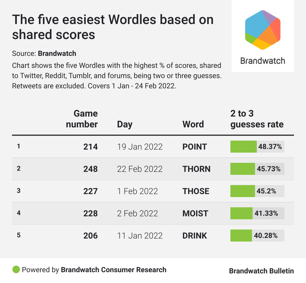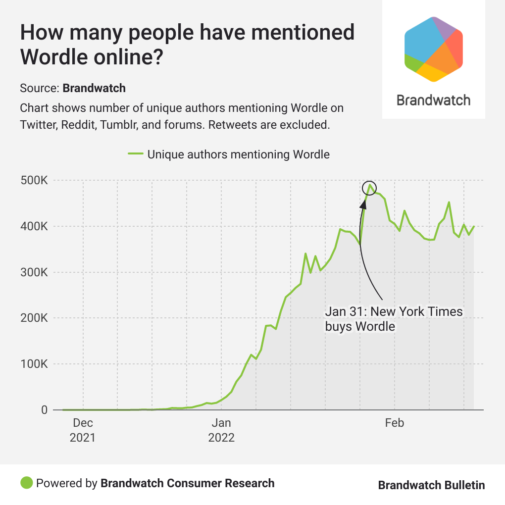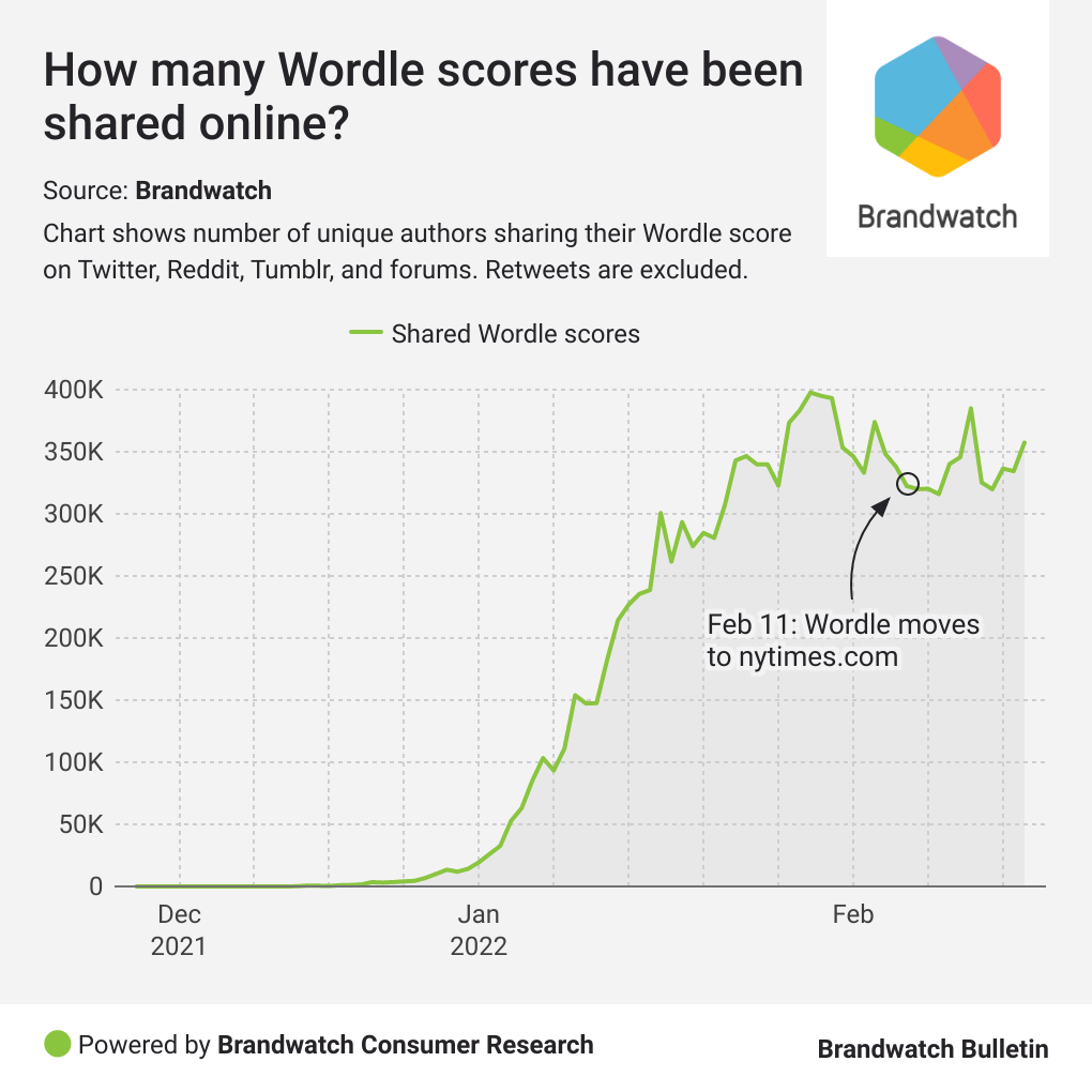 First you’ll notice how much of the Wordle conversation is taken up by shared scores. Generally it’s around 80% so, while a decent amount of people had complaints after the NYT bought Wordle, most people just posted their scores and moved on.