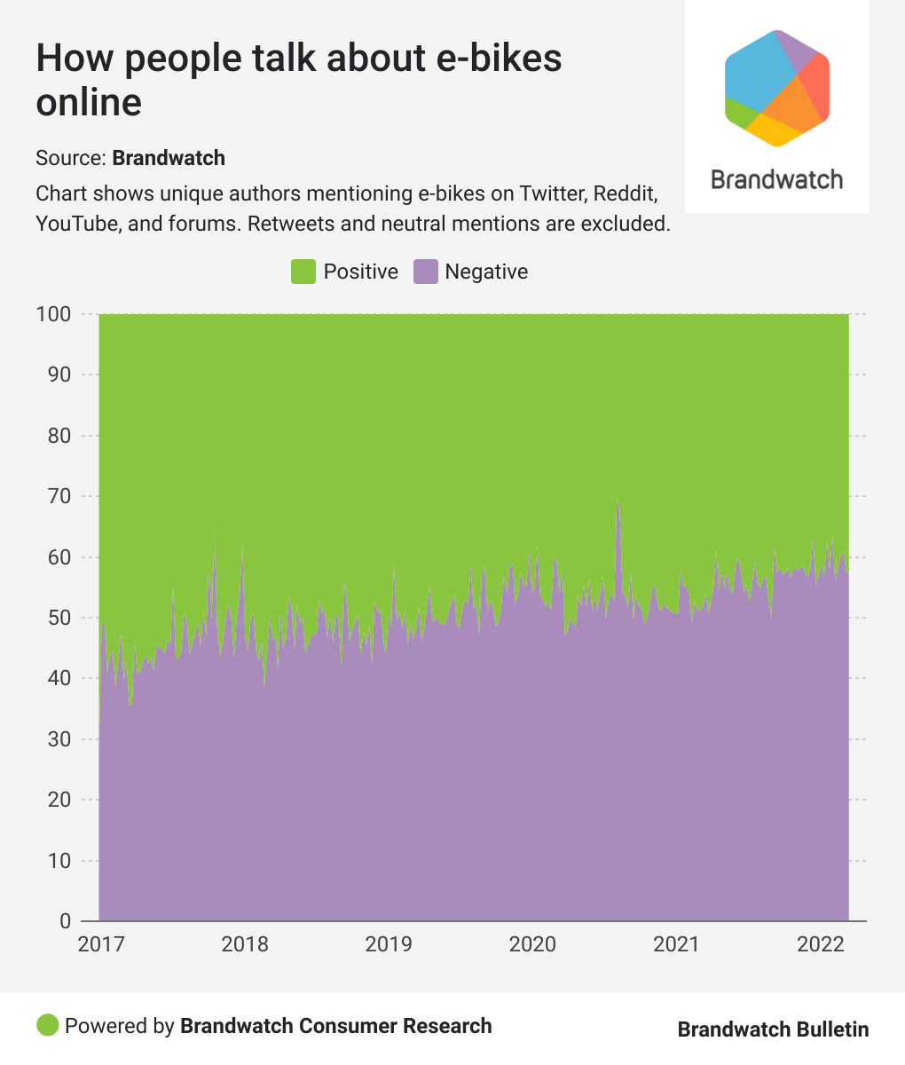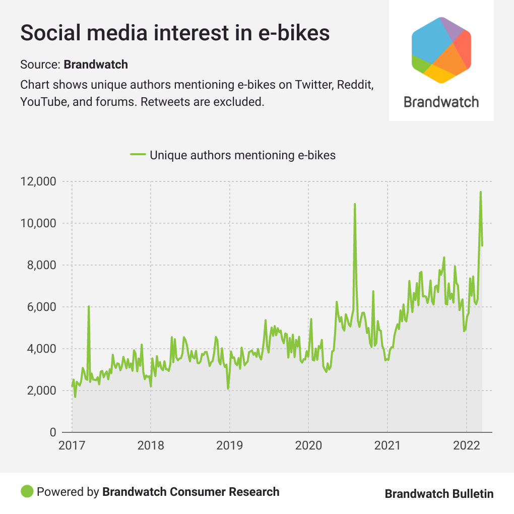 It’s not just search interest which is up either. We created a Brandwatch Consumer Research query to track mentions of e-bikes on Twitter, Reddit, YouTube, and forums to see how they are trending.