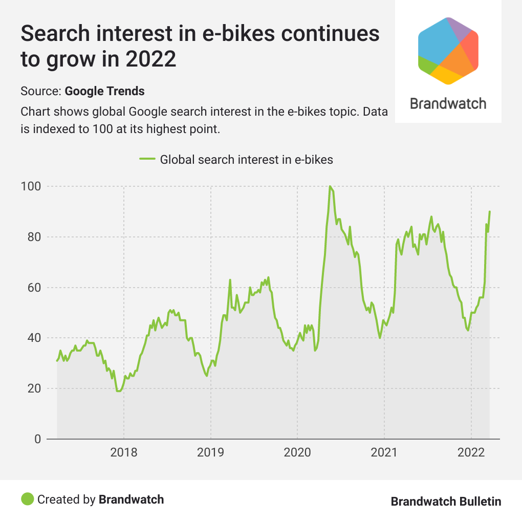 For 2022, that looks to continue. March is essentially the start of ‘e-bike season’ as warmer weather gets people on the saddle, and search interest this year is significantly above where it was at the same time in 2021. Good news for e-bike manufacturers.