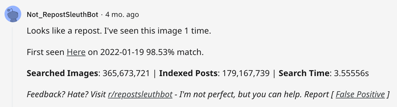 Let’s take the top Rickroll poster as an example. It’s the Reddit user Not_RepostSleuthBot, with 18k Rickrolls since 2019. This bot analyzes a Reddit post, determines whether it’s been posted before or not, and then replies with its results. But where does the Rickroll come in?