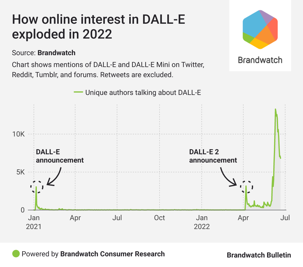 Based on our Consumer Research data, in the week of the DALL-E 2 launch, 7.6k people posted about it. A big help for this was people with access and Twitter accounts asking their followers to supply prompts. Unsurprisingly this was popular as users were itching to give the technology a go.
