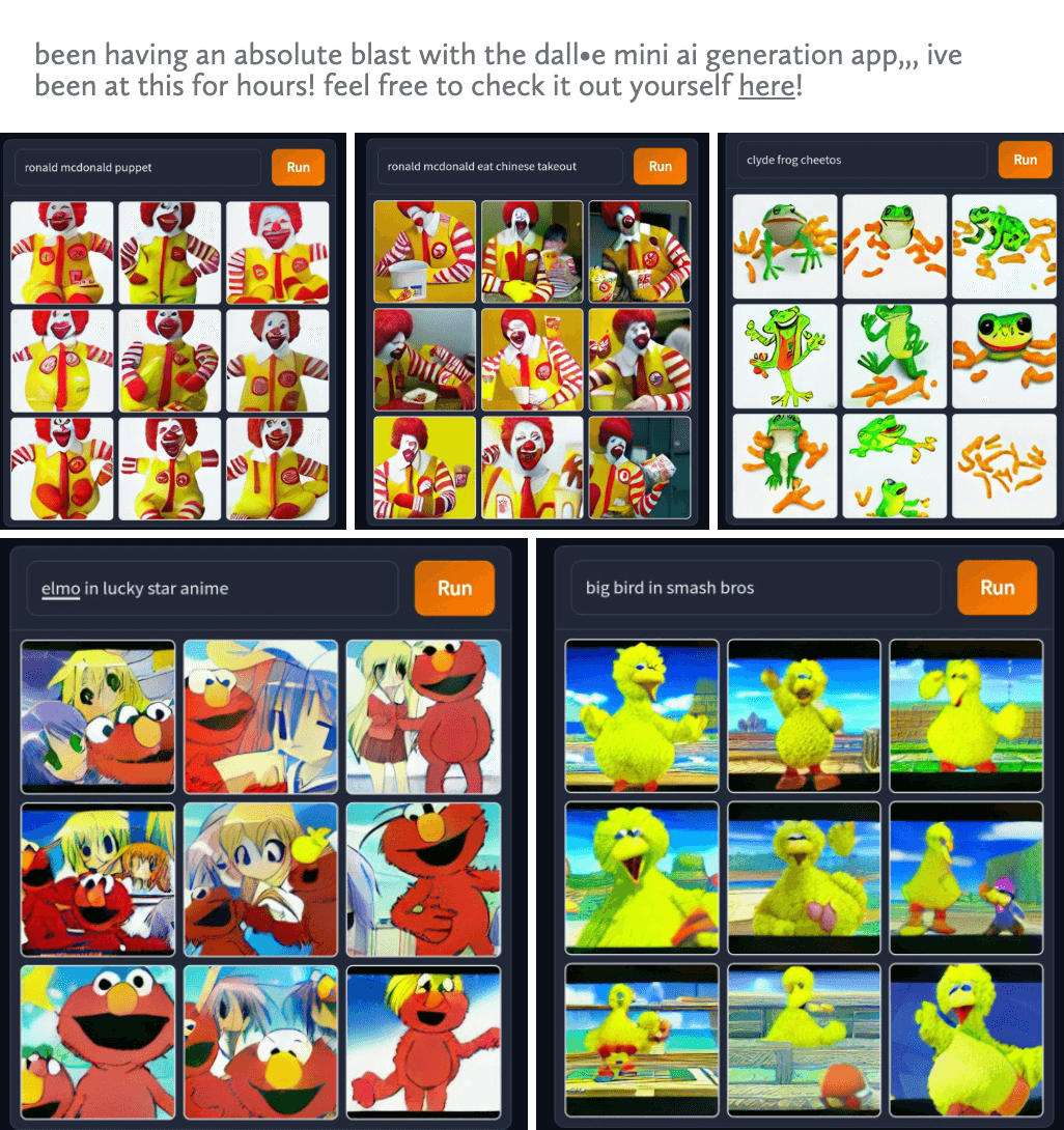 It received well over 200 shares that day, with interest on Twitter rising shortly after. Mentions of DALL-E Mini continued to rise, and by June 10 over 4.6k people were mentioning it specifically. Suddenly, you couldn’t open Twitter without seeing a 3×3 grid of strange and curious images, such as: