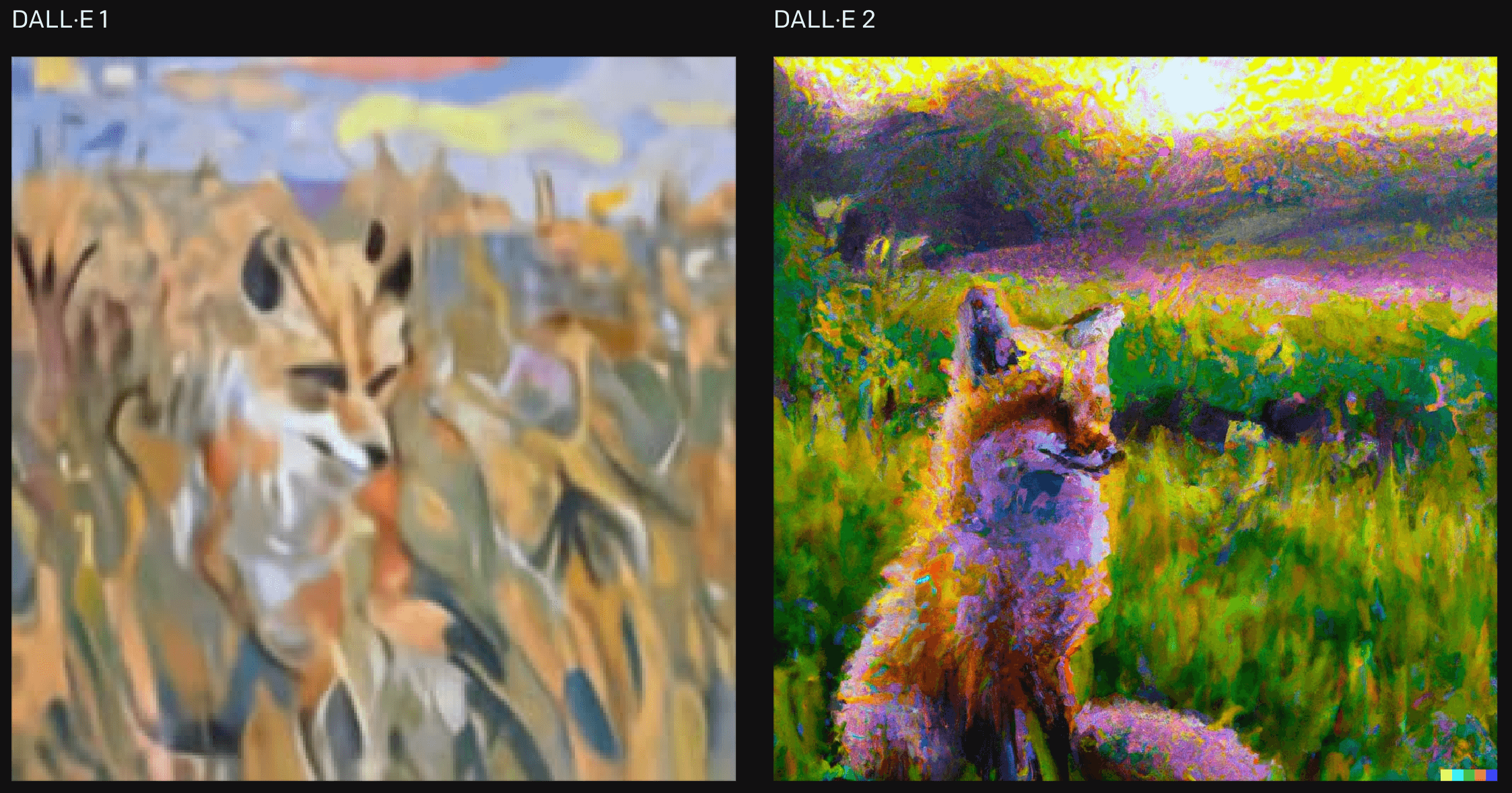 But interest soon died away, and beyond its users and the AI community, it was largely forgotten until April 2022 when DALL-E 2 was announced. This new and improved version vastly upped the quality of the images produced, as you can see in these comparison images for the prompt “a painting of a fox sitting in a field at sunrise in the style of Claude Monet.”