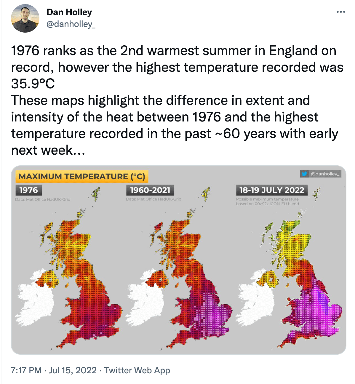 In their defence, the summer of 1976 was more extreme in some ways, including duration and drought. On the other hand, the highest temperature recorded back then was ‘just’ 35.9°C / 96.6°F. Meanwhile, the increasing frequency of these hot temperatures wasn’t such a major concern in the 70s.