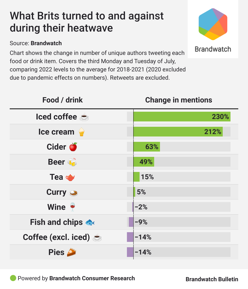 While the above discussions continued, the predicted heatwave descended on the UK, peaking on 18 and 19 July. People were seeking out ways to reduce their temperature, so we wondered if this changed the conversation volumes around certain foods and drinks.