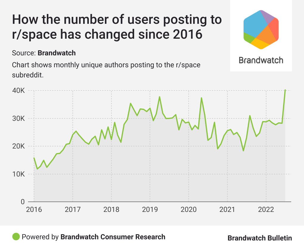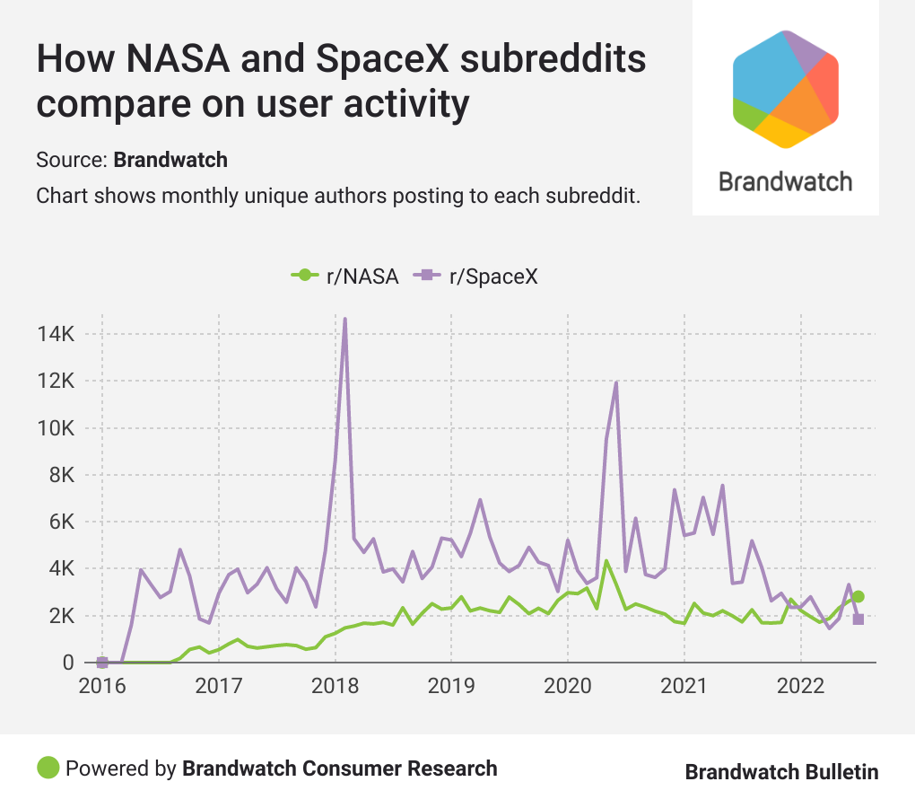 That looks to be changing, though. Since 2021, the number of users posting to r/SpaceX has been falling, while NASA’s numbers have remained steady. In 2022 they’re practically neck and neck, with early signs NASA is set to take the crown.