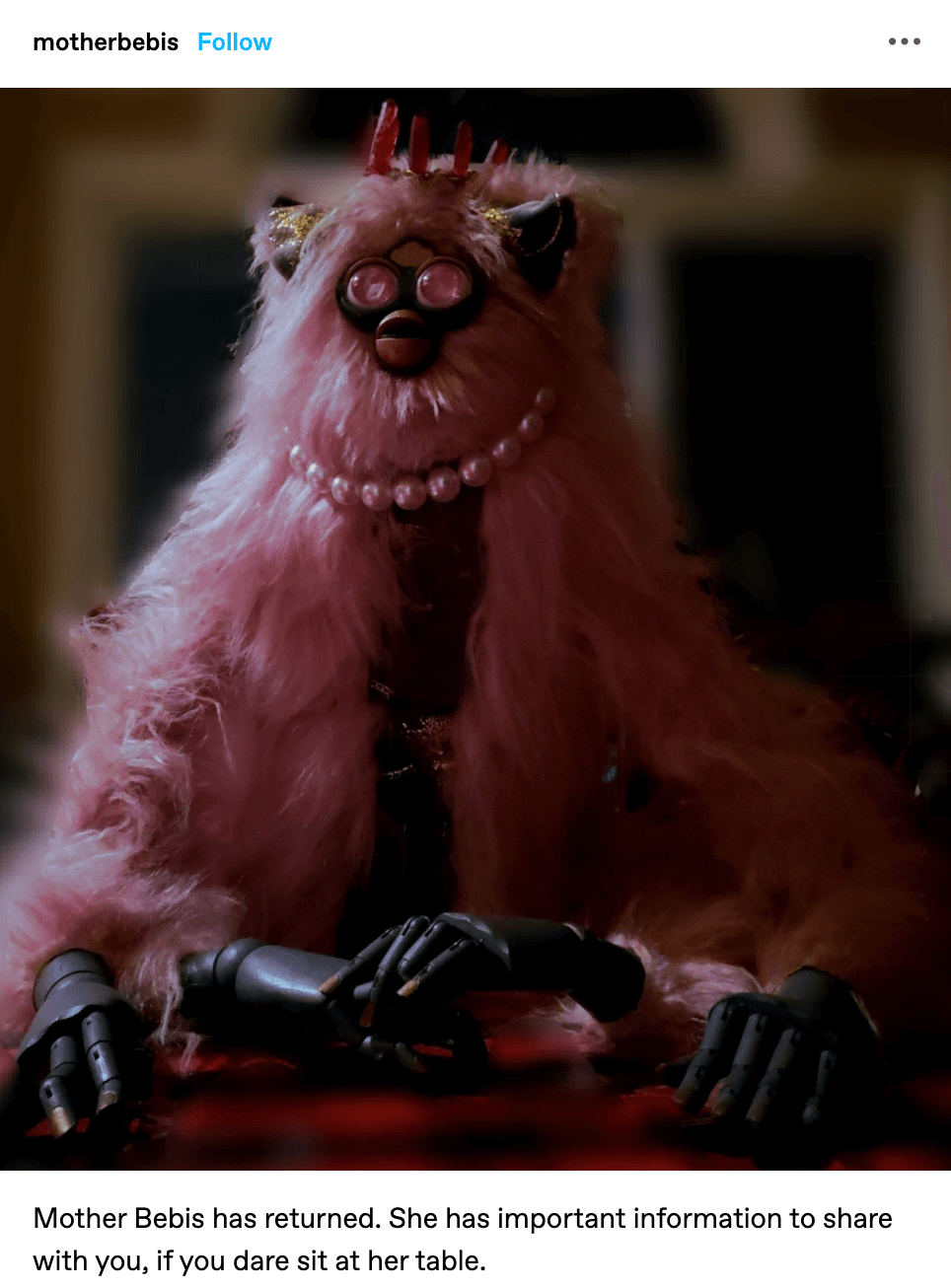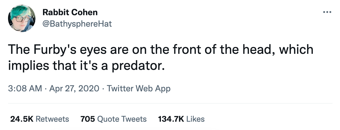 Most of the viral moments play on the oddness of Furbys, either using them as absurdist stand-ins or references, or implying something comedic about the toy itself. Like this one: