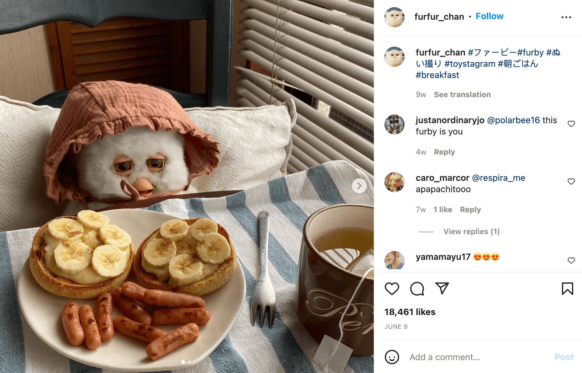 The above post comes from @furfur_chan, an Instagram account which is solely well-lit, well-shot, cozy pictures of a Furby (not an oddbody as far as my untrained eyes can see) enjoying delicious breakfasts. Aside from the furry robot, the scenes are indistinguishable from those posted by Instagram influencers.