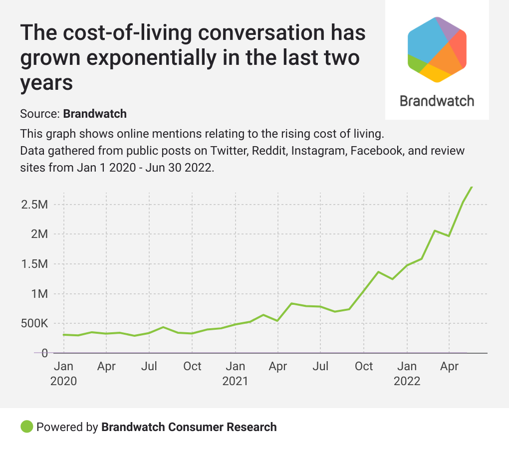 With the help of Consumer Research, we’ve examined online consumer conversations relating to the rising cost of living between January 1 2020 and June 30 2022.