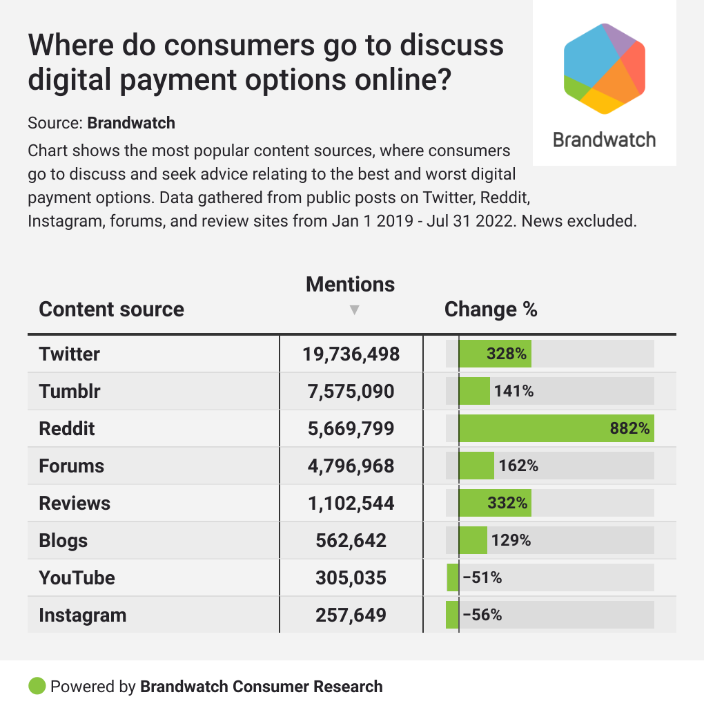 It turned out that while Twitter accumulated the most mentions relating to the digital payment topic, the conversation on Reddit has grown by 882% in the last year and a half, followed by review sites with a growth of 332%.