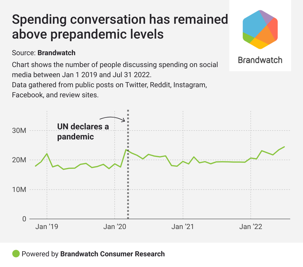 The volume of mentions about spending has remained higher than pre-pandemic. This year alone, there were close to 170 million mentions relating to spending, a 19% increase from the previous 7-month period.