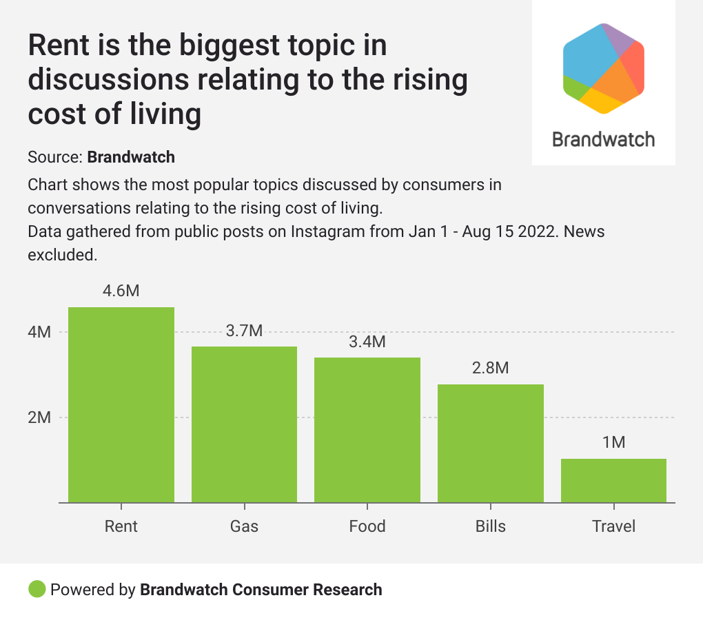 A breakdown of online conversations between January and August this year showed that consumers most often talked about the rising cost of living in relation to paying rent, followed by gas/petrol, food and groceries, bills, and traveling.