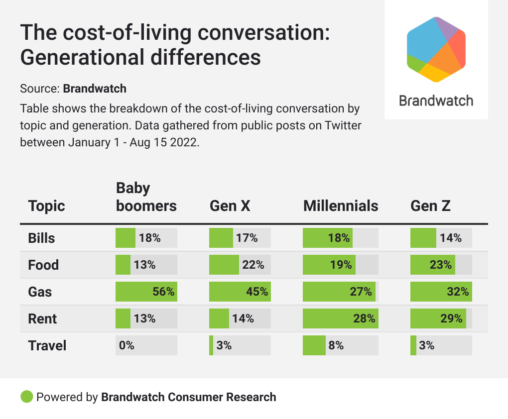 By examining this conversation further using Brandwatch’s Social Panels, we learned that there were some generational differences in how consumers discuss cost-of-living topics.
