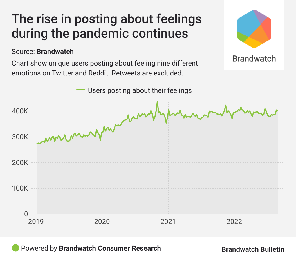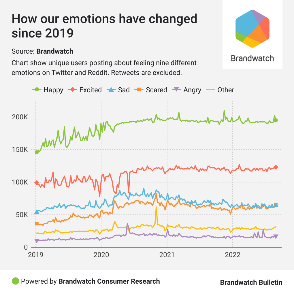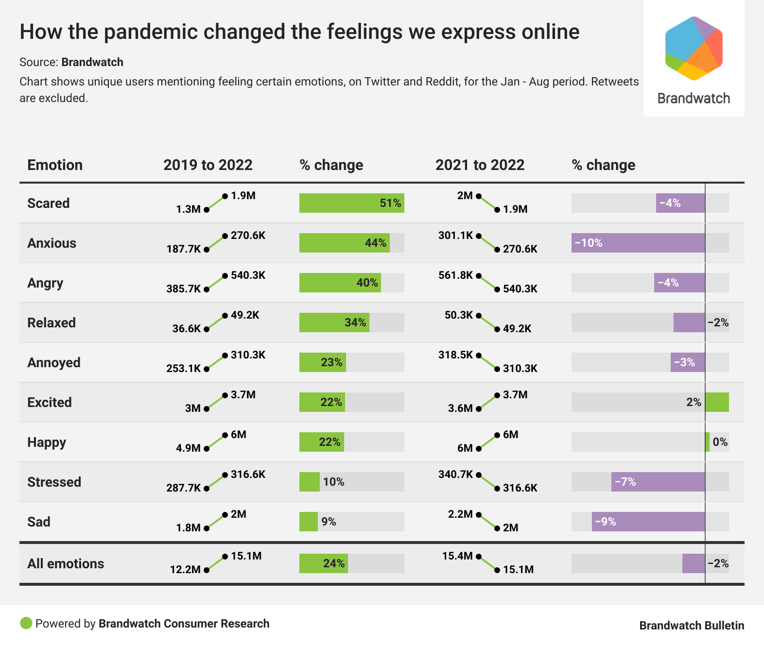 As we already know, all types of emotion posts are up compared to the pre-pandemic world of 2019. The number of users saying they were scared, anxious, and angry grew the most, which is to be expected considering the events of the last couple of years.