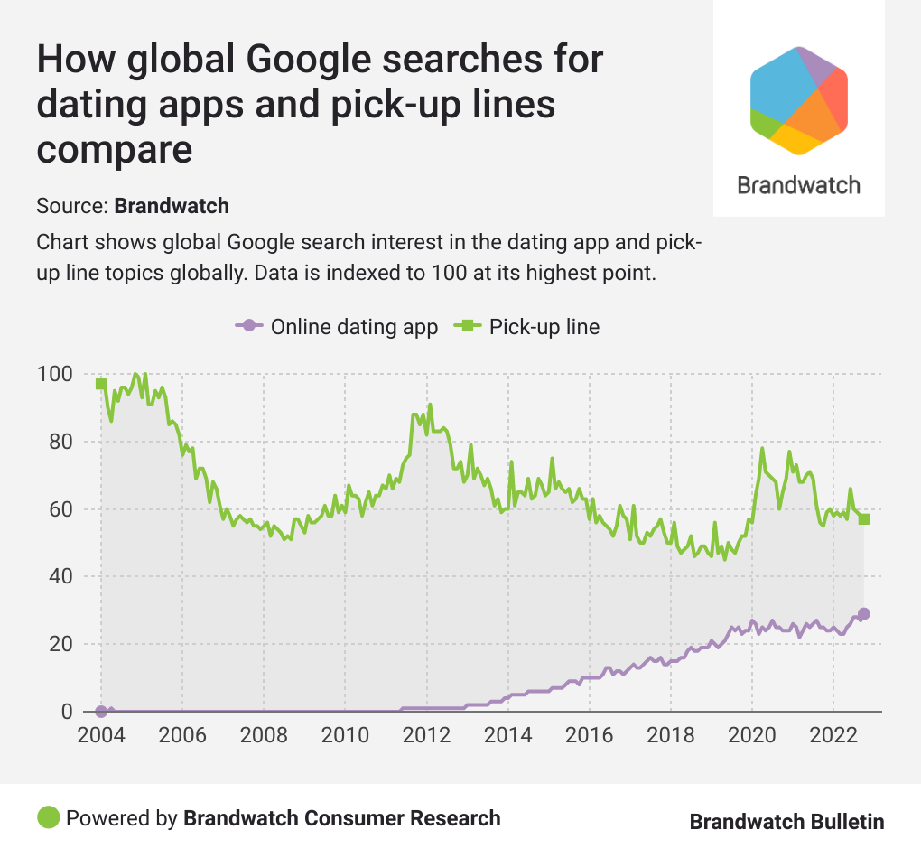 Interest in pick-up lines has seen a lot of volatility. They’re far less popular than they used to be, but why? For a start, the rise of “pick-up artists” and their behaviour has likely tarnished even the concept of pick-up lines. But it’s possible the rise of dating apps has had an effect too, as singletons are looking for different methods for finding a partner.