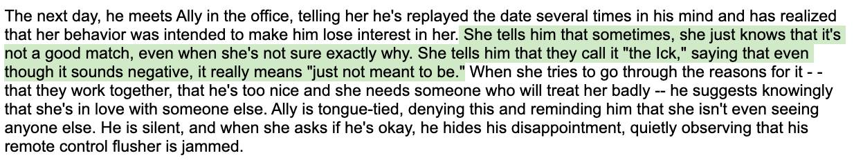 Four years later, “the ick” is actually used to describe a lack of interest in someone in an episode of Ally McBeal. That seems like a slam dunk on the ick origin story, but when we examine its usage more closely, we see it’s off the mark.