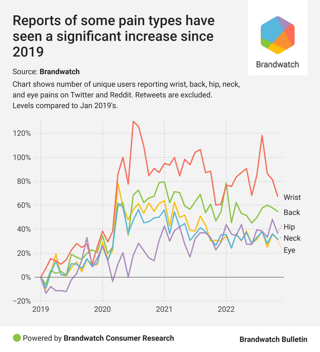 Wrist pain saw the largest increase in reports during the height of the pandemic, and has the largest increase compared to January 2019 levels than any other pain type. While there are many reasons for wrist pain, one of the big contributing factors may have been the mass switch from office working to home working.