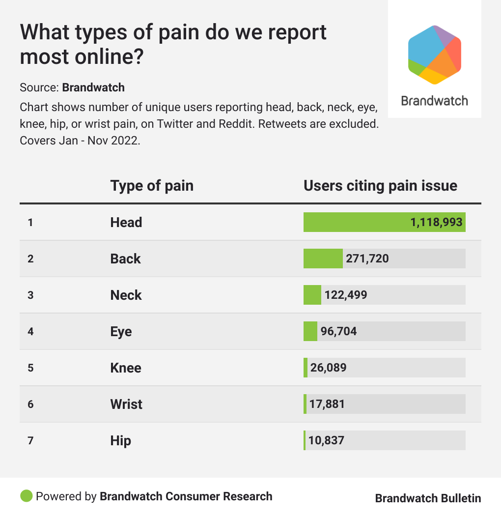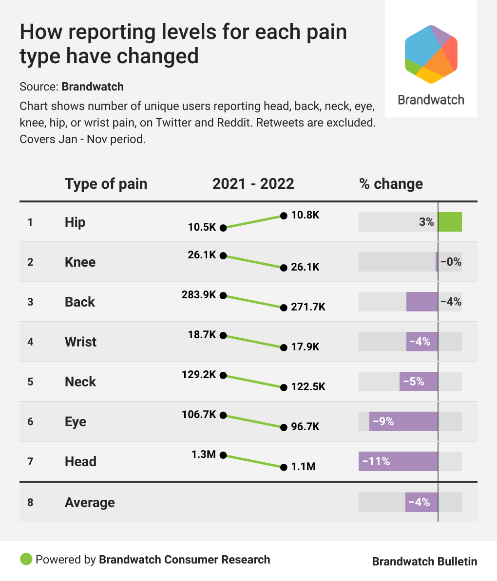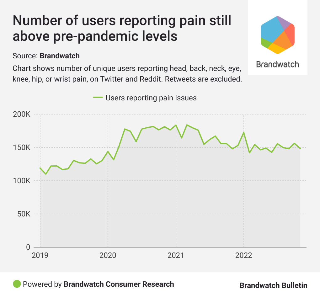 As we already knew, pain mentions are above their pre-pandemic levels, but it’s shocking to see just how much more some types of pain are being experienced.