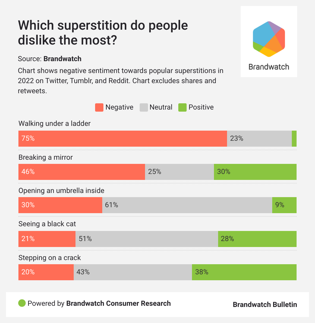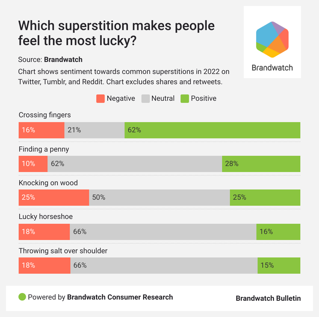 The classic “fingers crossed” is a go-to and is discussed most positively of the superstitions we analyzed. In fact, it accounted for 80% of total mentions among the above categories. This and “knock on wood” have become common turns of phrase as a quick pick-me-up for good luck. They’re embedded in our language, so much that many might even forget the superstitious origins of these phrases.