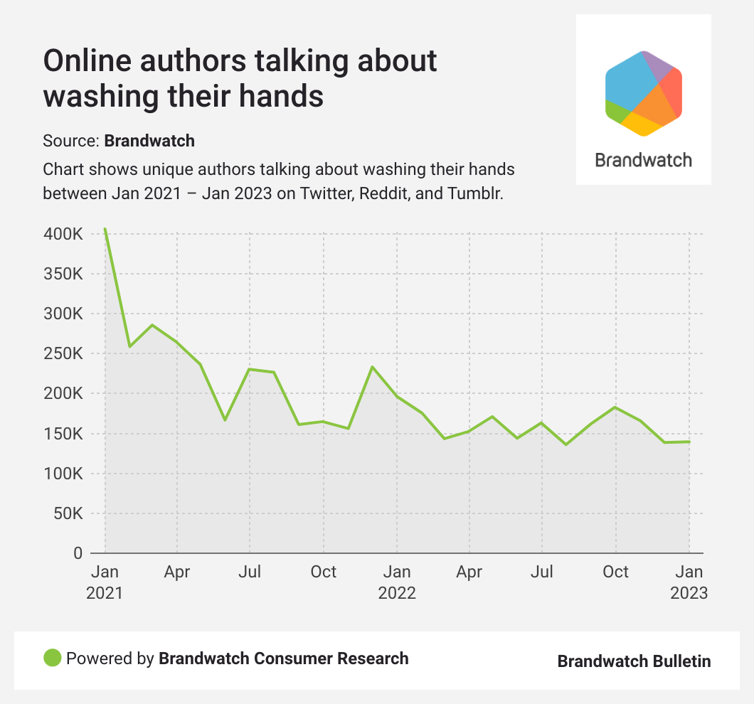 As expected, people aren’t as vocal about handwashing online as they were mid-pandemic. Instead, we’ve settled into a more steady rhythm of handwashing commentary. Interestingly, the handwashing conversation is now lower than it was pre-pandemic. In 2019, a monthly average of 131k unique authors discussed washing hands on social media. In 2022, that average was 122k authors.