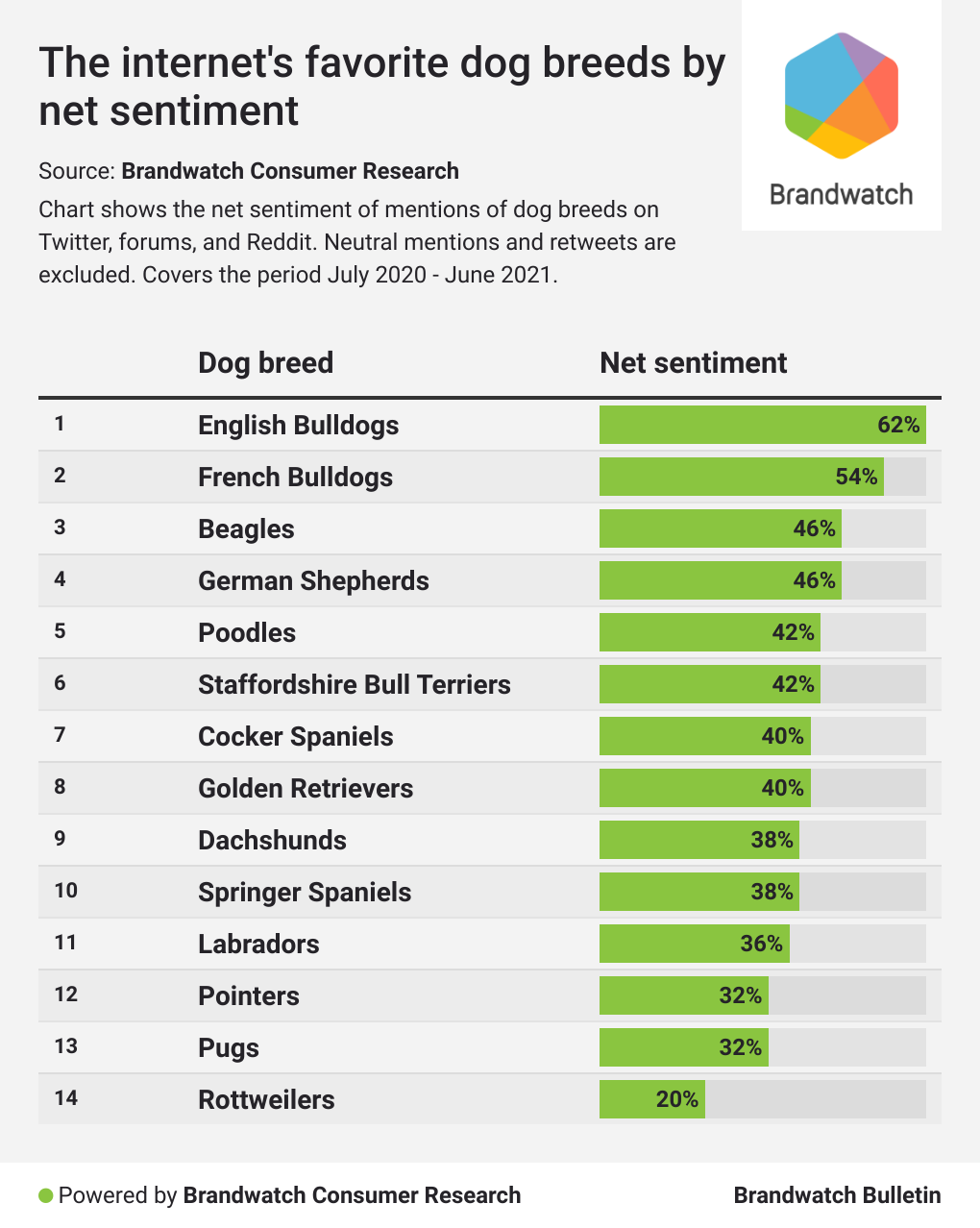 To start, not a single breed got more negative mentions than positive ones, proving that all dogs are good dogs (not that this needed proving). In fact, the net sentiment of the entire dog breed conversation was 40%, a very strong number.