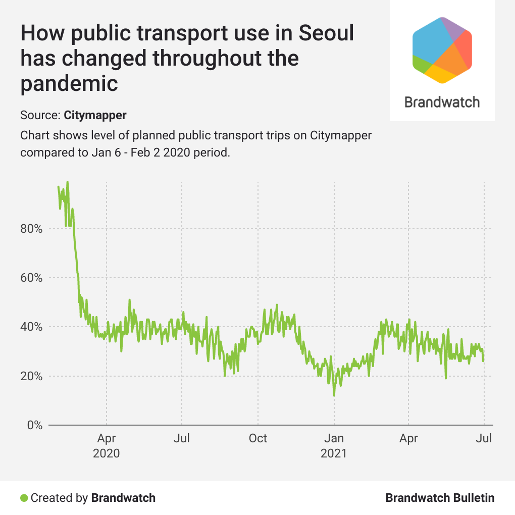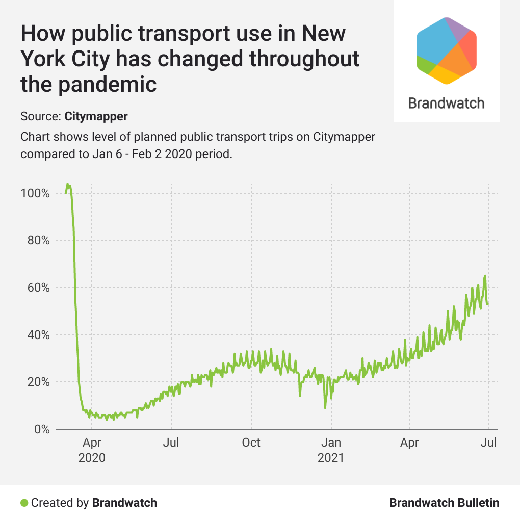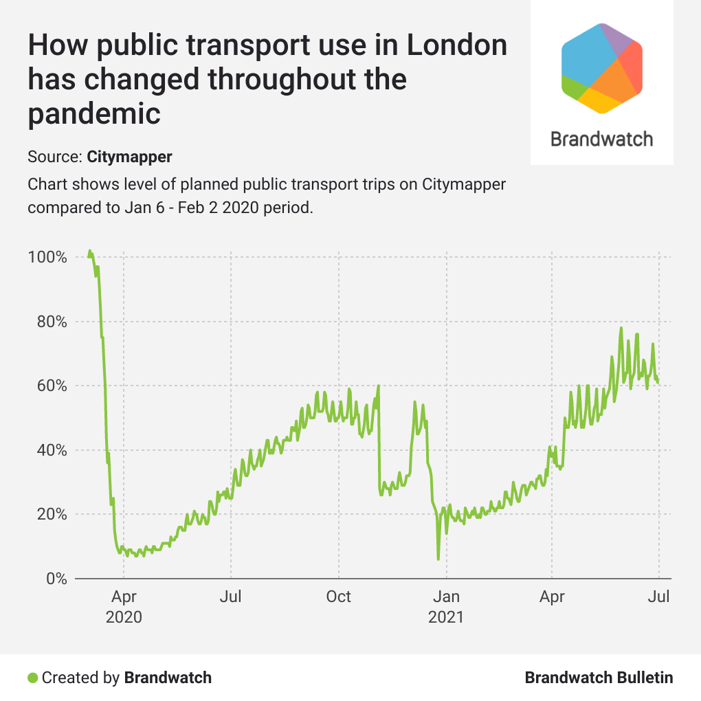 It’s not the first time numbers were so high either. Back in September 2020, levels briefly hit 96% of ‘normal’ use, an incredibly high level for that time in the pandemic. The speed of recovery from May 2021 onwards has been staggering too. With cases low in the city, it’s possible we may see numbers exceed pre-pandemic levels.