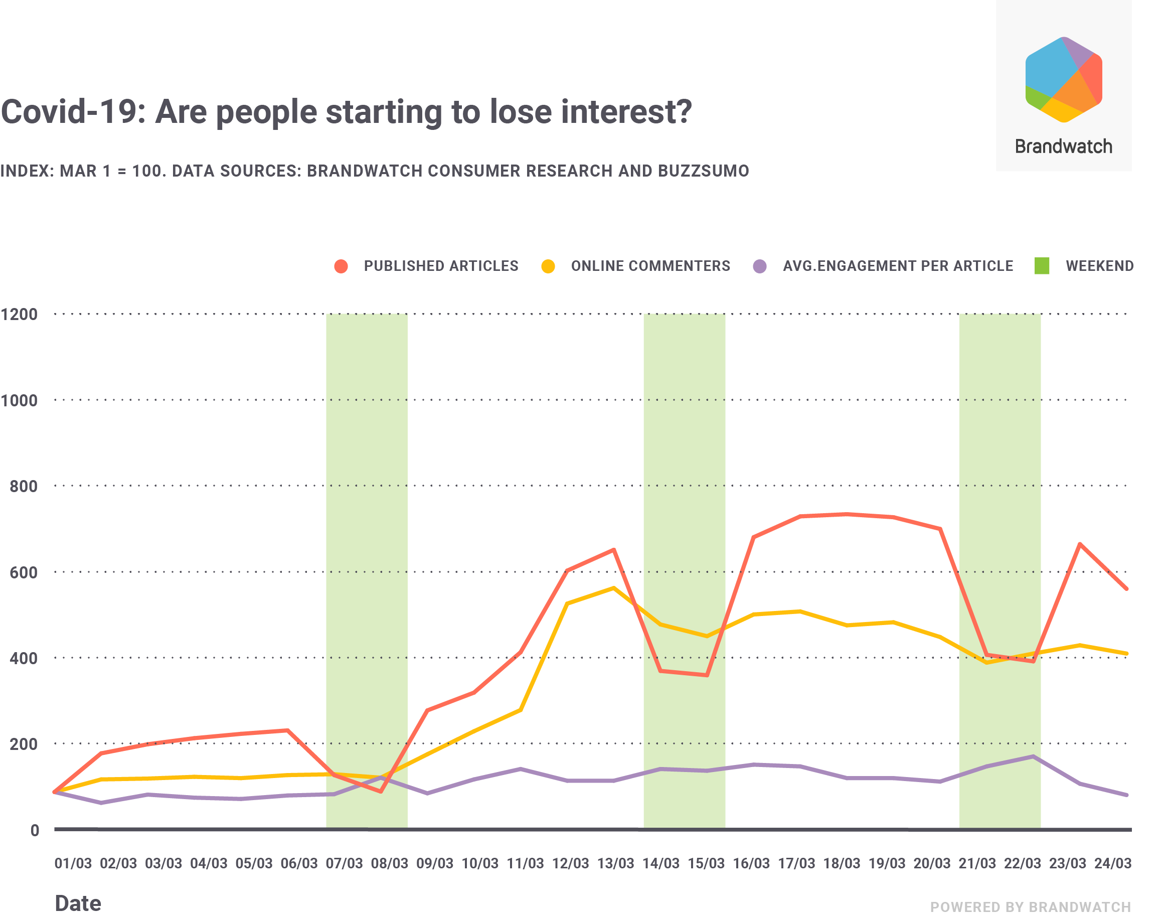 Online interest in fashion, especially loungewear, has peaked too, with 17.8k English-langue mentions online. This seems to have been boosted by sales promotions, which were mentioned 505k times on social.